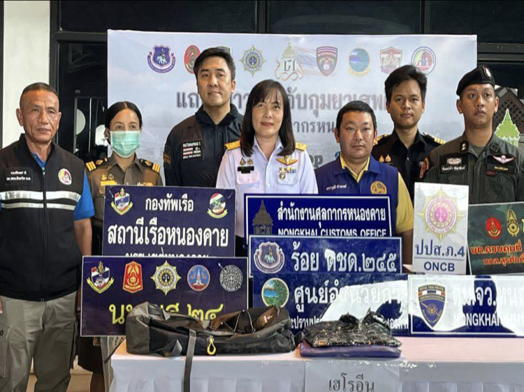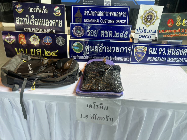 ร้อย.อส.จ.นค.1 บก.อส.จ.หนองคาย ร่วมกันแถลงข่าวการจับกุมผู้ต้องหาขนเฮโรอีน 1.5 กิโลกรัม ผ่านด่านพรมแดนหนองคาย