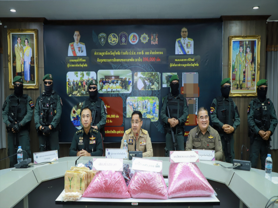 ผบ.อส.จ.สท. บก.อส.จ.สุโขทัย เป็นประธานการร่วมแถลงข่าวผลการปราบปรามยาเสพติด กรณีจับกุมผู้ต้องหา 3 ราย พร้อมของกลางยาบ้า 396,000 เม็ด