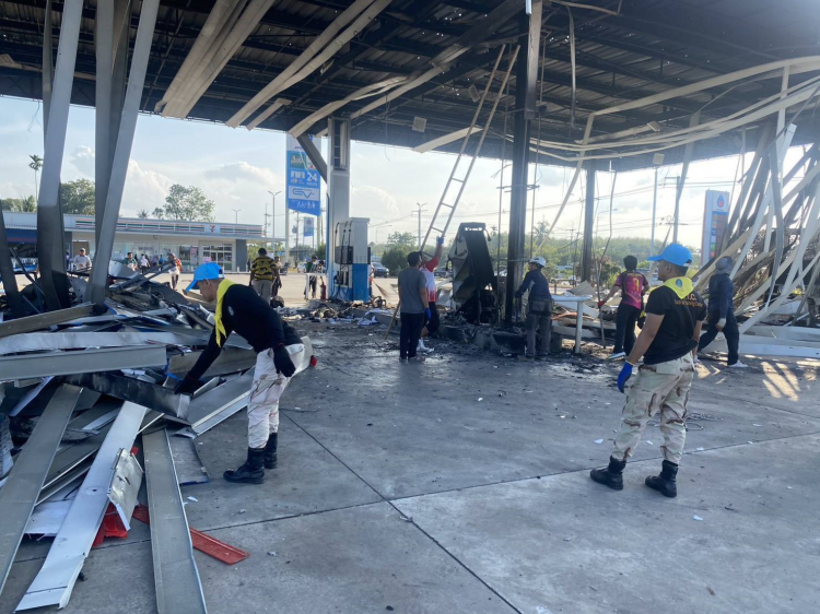 ร้อย.อส.อ.เมือง ยล.2 บก.อส.จ.ยะลา ช่วยบรรเทาความเดือดร้อนร่วมทำความสะอาดปั๊มน้ำมันหลังเกิดเหตุคนร้ายลอบวางระเบิดให้กลับมาใช้งานได้โดยเร็ว