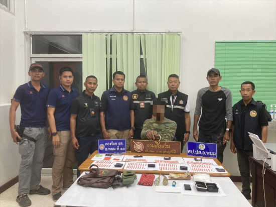 นายจุมพฏ วรรณฉัตรสิริ ผบ.อส.จ.สุราษฎร์ธานี นายจักรกฤษณ์ ฝั่งชลจิตร์ รอง ผบ.อส.จ.สุราษฎร์ธานี นายชวลิต โรจนรัตน์ หน.ฝอ.บก.อส.จ.สุราษฎร์ธานี นายสันติ บุญรอด ผบ.ร้อย.อส.อ.พนม 10 นายพิชัย สุดสวาสดิ์ ป.หน.กง.บป. สั่งการให้ นายธิติสรรค์ พิมลศรี ป.ฝ.คม. นำกำลังสมาชิก อส. สังกัด ร้อย.อส.อ.พนม 10 พร้อมด้วยเจ้าหน้าที่ตำรวจ ลงพื้นที่ ม.11 ต.ต้นยวน อ.พนม จ.สุราษฎร์ธานี ผลการปฏิบัติสามารถจับกุมผู้ต้องหาได้ 2 ราย พร้อมของกลางยาบ้า จำนวน 1,499 เม็ด และไอช์ น้ำหนัก 1.4 กรัม โดยแจ้งข้อกล่าวหาว่า จำหน่ายยาเสพติดให้โทษประเภท 1 (เมทแอมเฟตามีน) โดยการมีไว้เพื่อจำหน่ายอันเป็นการกระทำเพื่อการค้าและก่อให้เกิดการแพร่กระจายในกลุ่มประชาชนโดยไม่ได้รับอนุญาต มียาเสพติดให้โทษประเภท 1 (เมทแอมเฟตามีน) ไว้ในครอบครองโดยไม่ใดรับอนุญาต และเสพยาเสพติดให้โทษประเภท 1 (เมทแอมเฟตามีน) โดยไม่ได้รับอนุญาต จากนั้นได้นำผู้ต้องหาพร้อมของกลางทั้งหมดส่งพนักงานสอบสวน สภ.พนม เพื่อดำเนินคดีตามกฎหมายต่อไป