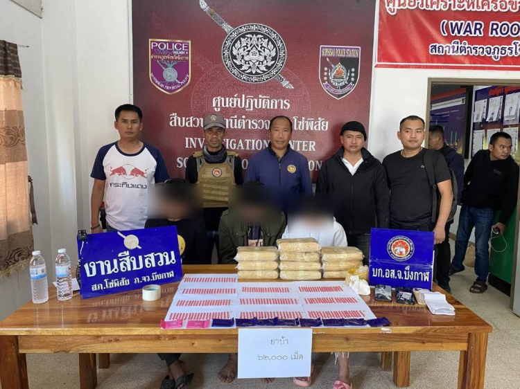 ร้อย.อส.จ.บก.1 บก.อส.จ.บึงกาฬ ปฏิบัติการกวาดล้างยาเสพติด จับกุมผู้ต้องหา 3 ราย พร้อมยาบ้า 62,000 เม็ด