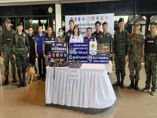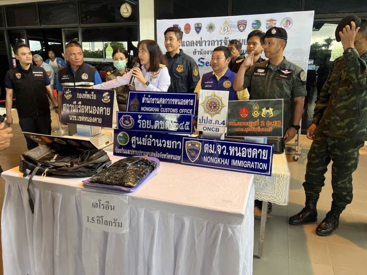 ร้อย.อส.จ.นค.1 บก.อส.จ.หนองคาย ร่วมกันแถลงข่าวการจับกุมผู้ต้องหาขนเฮโรอีน 1.5 กิโลกรัม ผ่านด่านพรมแดนหนองคาย