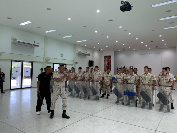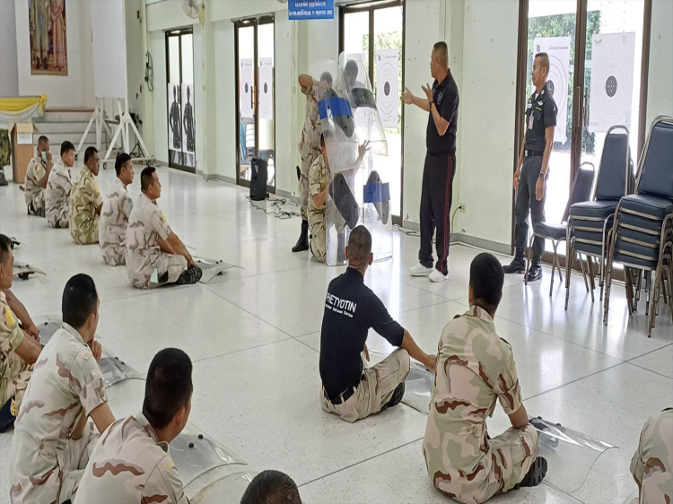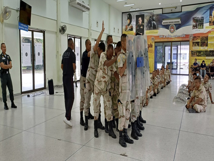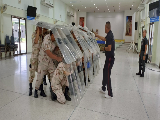 ร้อย.ปฝ.2 บก.อส. ฝึกบุคคลประกอบโล่และการใช้โล่ ท่าถือโล่ ท่าพักโล่ ท่าวางโล่ ท่าใช้โล่ทางยุทธวิธี ยุทธวิธีการควบคุมฝูงชนขนาดเล็กและขนาดกลาง (UN) เพื่อเตรียมความพร้อมในการปฏิบัติหน้าที่ ณ จ.สระแก้ว