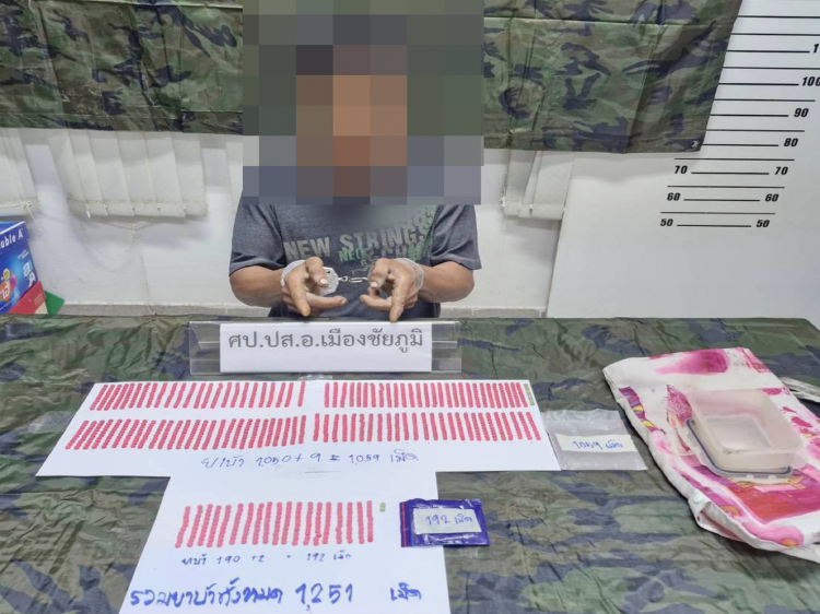 ร้อย.อส.อ.เมือง ชย.2 บก.อส.จ.ชัยภูมิ เปิดปฏิบัติการกวาดล้างยาเสพติด สร้างชุมชนปลอดภัยห่างไกลยาเสพติด จับผู้ต้องหา 1 ราย พร้อมของกลางยาบ้า 1,251 เม็ด